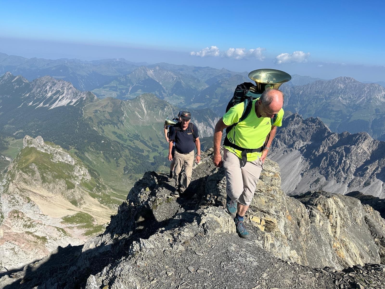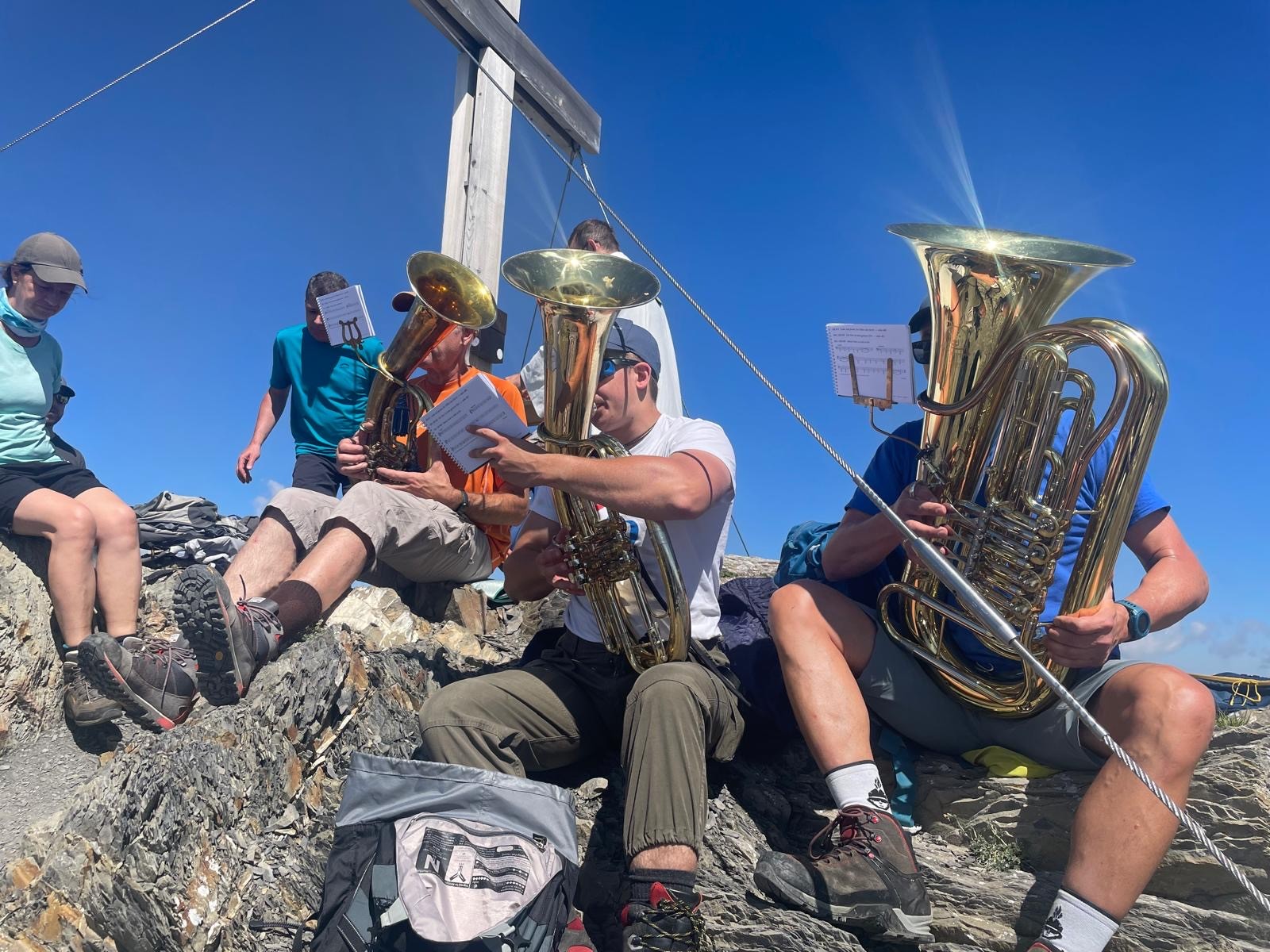 Schon bei der feierlichen Gipfelmesse im Jahr 2020 waren wir als Gemeindemusik Schnifis mit dabei. Auch heuer, am 10. August 2025, machten sich wieder einige Musikantinnen und Musikanten bei traumhaftem Bergwetter auf den Weg zum 2.704 Meter hohen Gipfel, um die Messe zum 5-jährigen Jubiläum des neuen Kreuzes musikalisch mitzugestalten.